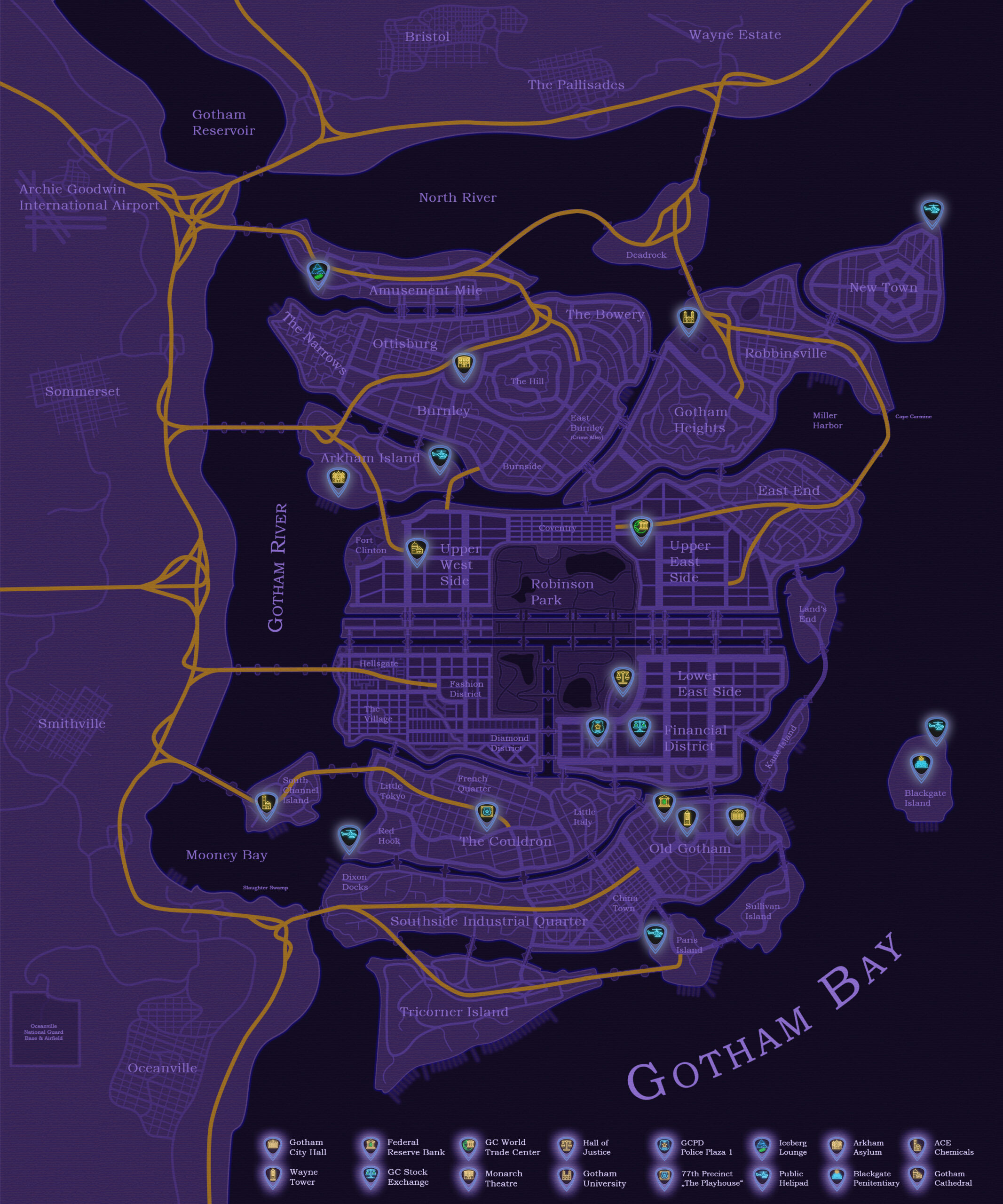 Die Karte von Gotham City und Umgebung wurde speziell für diese Kampagne erstellt und entwickelt. Sie basiert auf Recherchen aus der gesamten Batman-Franchise inklusive der Comics, Graphic Novels, Filme und Video Games, die für „Gotham – The Dark City“ neu interpretiert und zusammengestellt wurden.